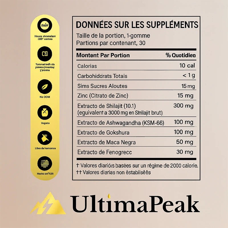 UltimaPeak™ Shilajit Gold est testé en laboratoire pour vous offrir une qualité irréprochable. Sans OGM, sans hormones et adapté aux végans, chaque ingrédient est sélectionné pour sa pureté et son efficacité. Vous savez exactement ce que vous consommez et pourquoi cela fonctionne.